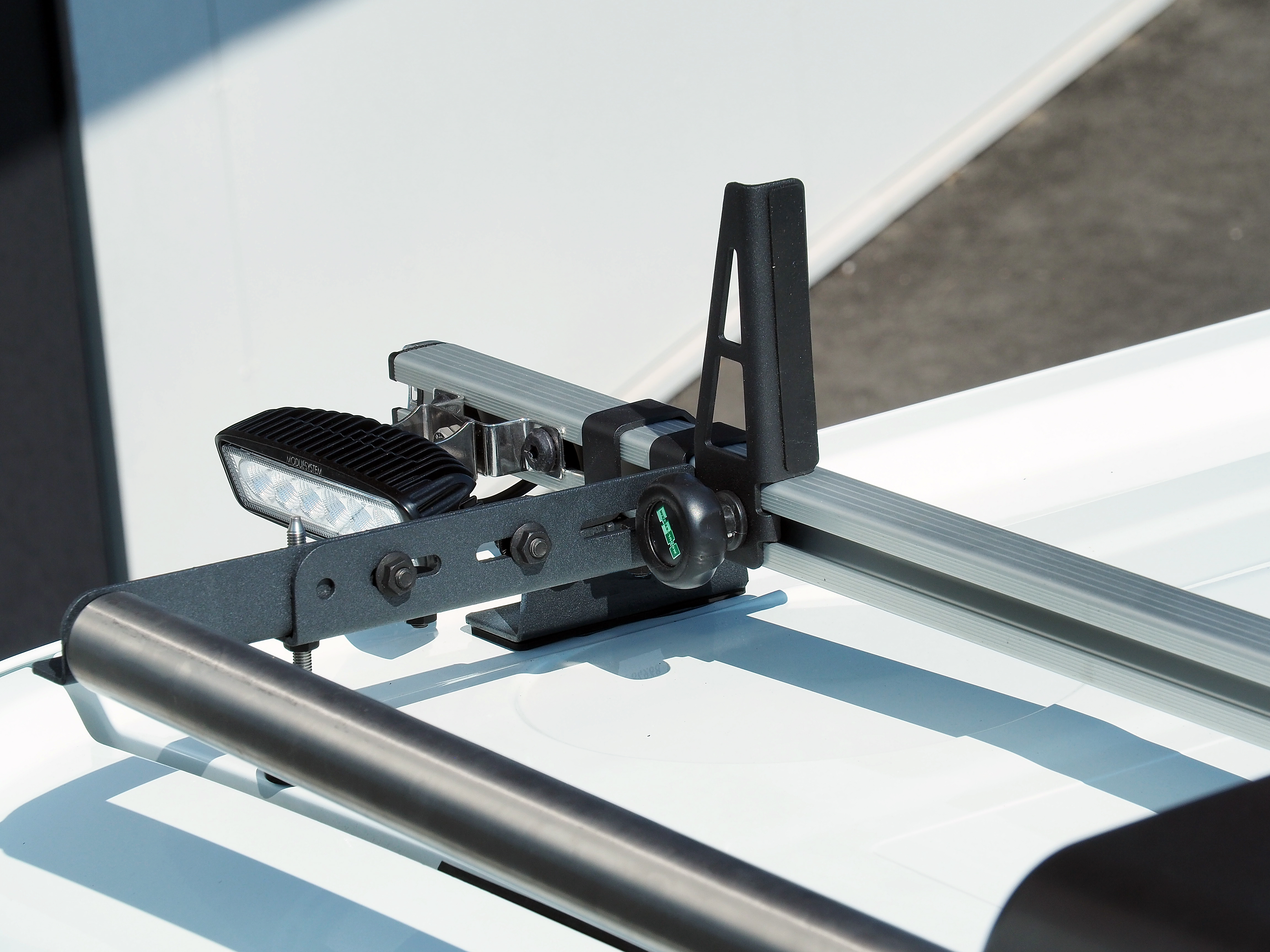 Para optimizar el peso, las barras están hechas de aluminio de alta resistencia. Todos los soportes están fabricados en acero inoxidable con recubrimiento en polvo y los detalles de acabado, como las tapas de remate, son de plástico. La ranura en T (M8) integrada en las barras de techo permiten la instalación rápida y sencilla de soportes de iluminación, topes de carga, amarres y otros accesorios.