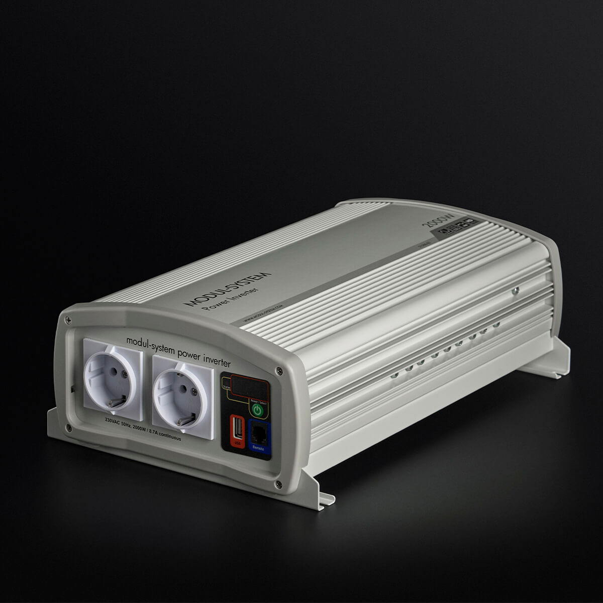 Inversor de onda senoidal pura que convierte el suministro de CC de la batería a CA. El inversor cuenta con la marca CE, la marca E y está probado para compatibilidad electromagnética (EMC).