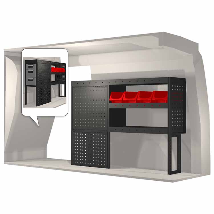 El equipamiento ha sido especialmente diseñado para garantizar el ajuste óptimo para el vehículo, así como la mayor funcionalidad y seguridad posible. Se ha desarrollado para uso profesional, es versátil y está destinado para trabajos de servicio en diversos tipos de negocio. Todas las estanterías están equipadas con alfombrillas de goma, y todos los cajones con alfombrillas de espuma de plástico. Los accesorios de montaje están incluidos.