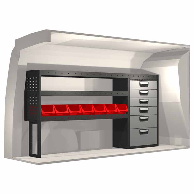 El equipamiento ha sido especialmente diseñado para garantizar el ajuste óptimo para el vehículo, así como la mayor funcionalidad y seguridad posible. Se ha desarrollado para uso profesional, es versátil y está destinado para trabajos de servicio en diversos tipos de negocio. Todas las estanterías están equipadas con alfombrillas de goma, y todos los cajones con alfombrillas de espuma de plástico. Los accesorios de montaje están incluidos.