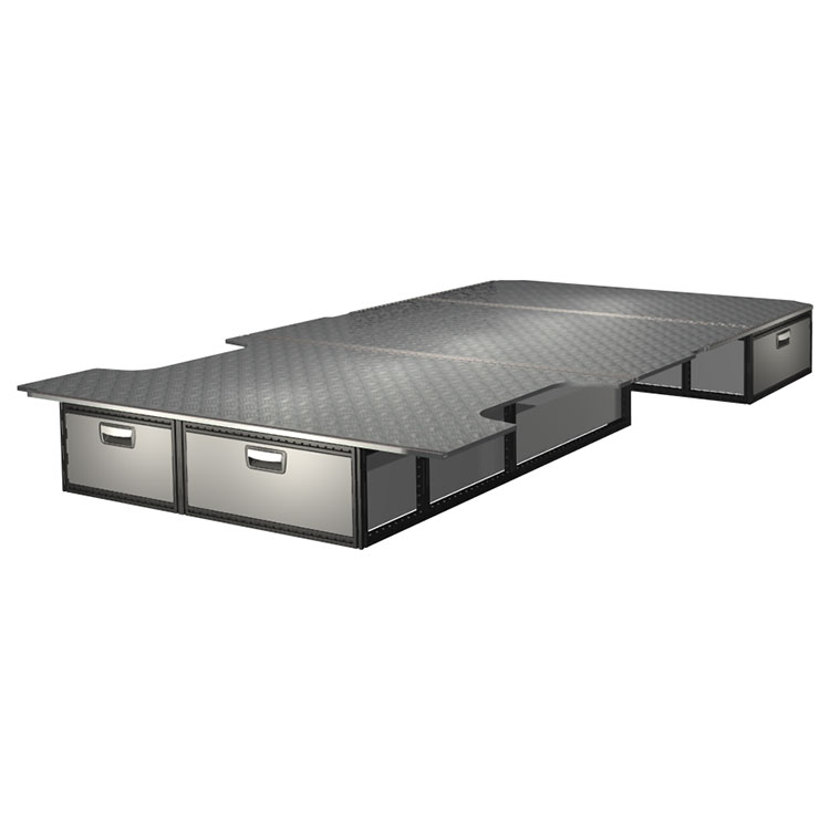 The kit is designed to be fitted on top of a Modul-Floor, utilizing the floor rails for a non-intrusive installation. The double floor is equipped with rails for easy installation of vehicle racking, and edging strips for a nice finish.