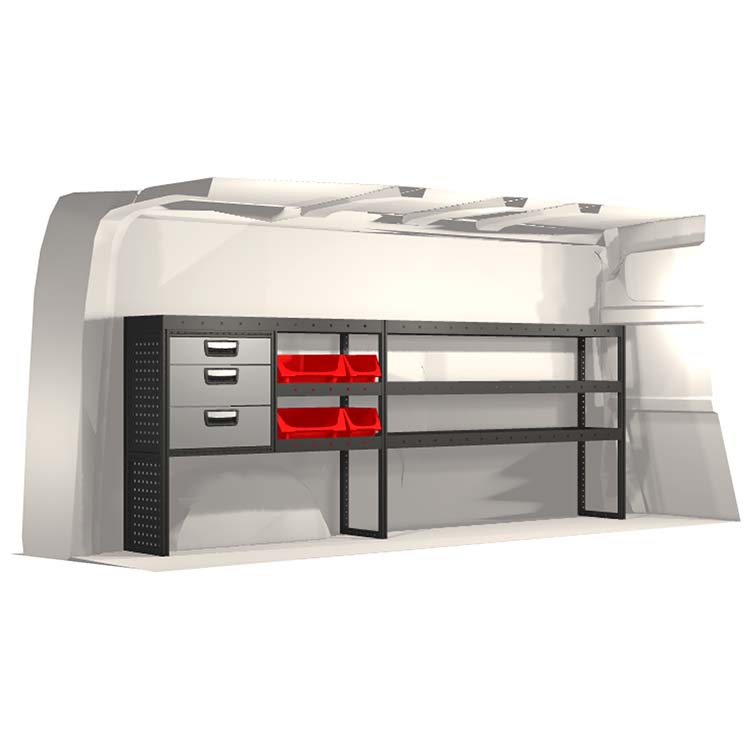El equipamiento ha sido especialmente diseñado para garantizar el ajuste óptimo para el vehículo, así como la mayor funcionalidad y seguridad posible. Se ha desarrollado para uso profesional, es versátil y está destinado para trabajos de servicio en diversos tipos de negocio. Todas las estanterías están equipadas con alfombrillas de goma, y todos los cajones con alfombrillas de espuma de plástico. Los accesorios de montaje están incluidos.