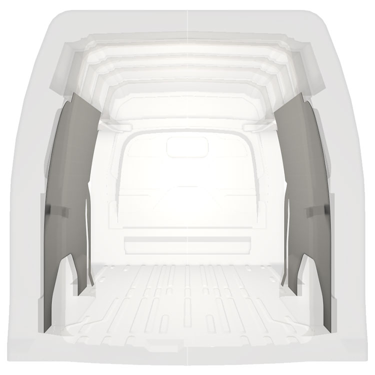 Revestimiento integral ligero para paredes internas de Ford Transit Custom con puerta lateral a ambos lados. Los revestimientos crearán un entorno de trabajo luminoso y agradable y son fáciles de limpiar.