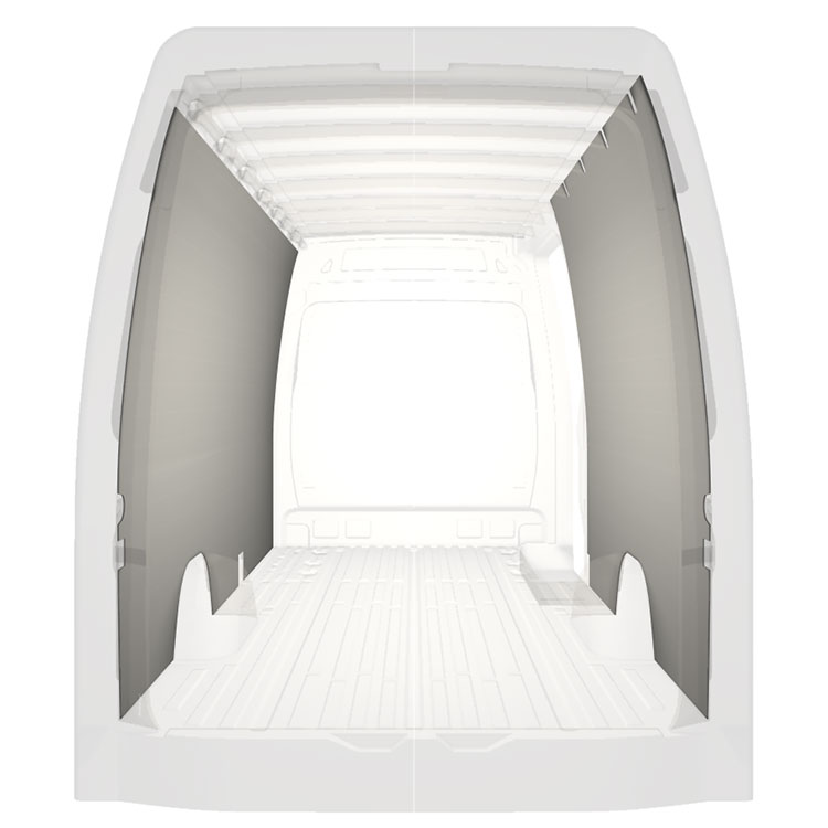 Revestimiento integral ligero para paredes interiores de Mercedes Sprinter con puerta lateral a la derecha. Los revestimientos crearán un entorno de trabajo luminoso y agradable y son fáciles de limpiar.