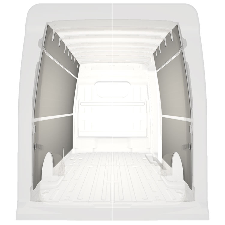 Revestimiento panelado ligero para paredes interiores de Volkswagen Crafter / MAN TGE con puerta lateral a la derecha. Los revestimientos crearán un entorno de trabajo luminoso y agradable y son fáciles de limpiar.