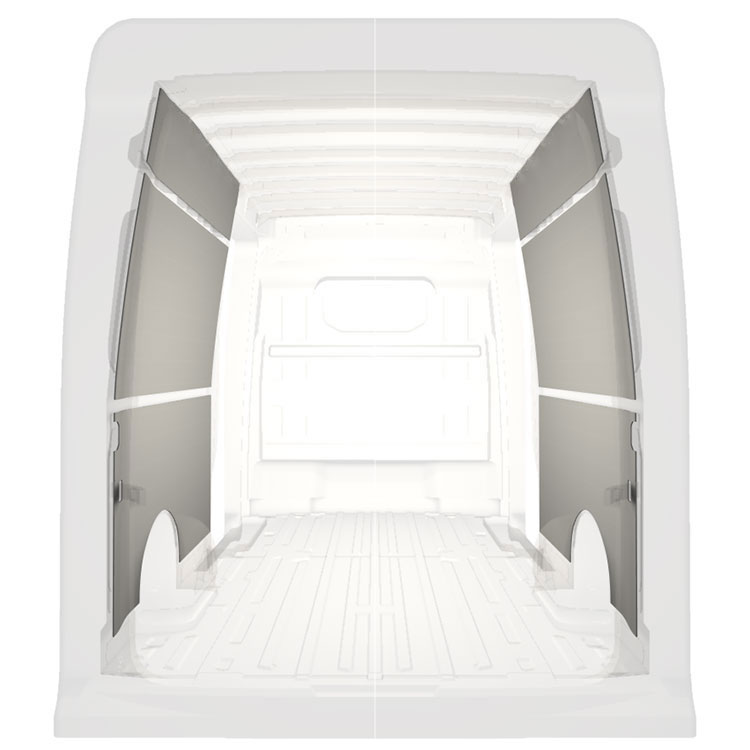 Panelado precortado ligero para paredes interiores de Volkswagen Crafter / MAN TGE con puerta lateral a ambos lados. Los revestimientos crearán un entorno de trabajo luminoso y agradable y son fáciles de limpiar.
