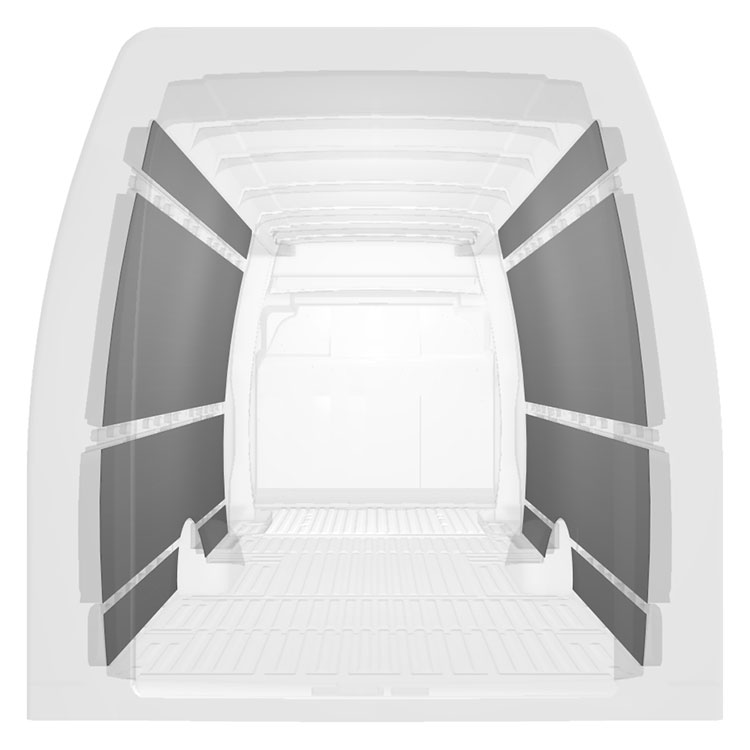Panelado precortado ligero para paredes interiores de Iveco Daily con puerta lateral a ambos lados. Los revestimientos crearán un entorno de trabajo luminoso y agradable y son fáciles de limpiar.