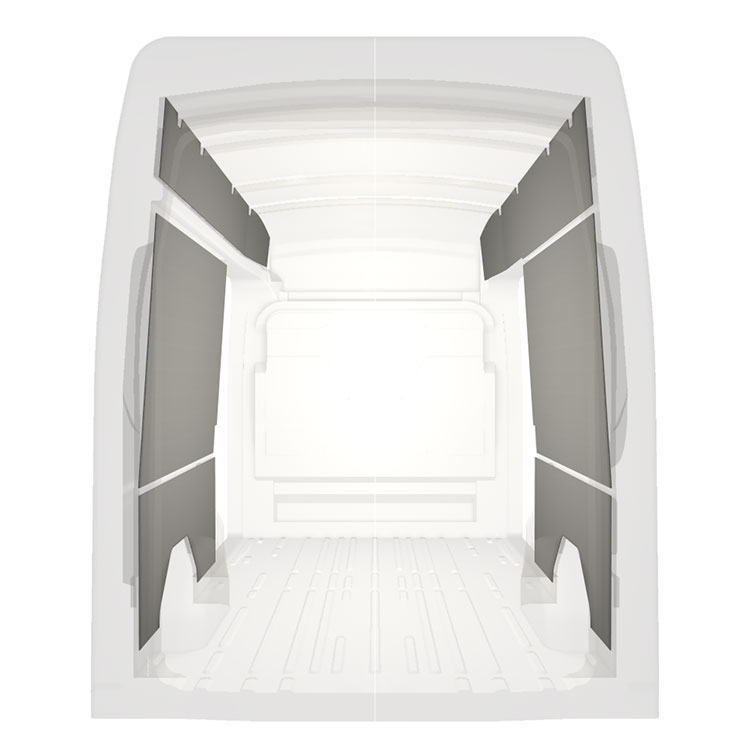 Panelado precortado ligero para paredes interiores de Ford Transit con puerta lateral a ambos lados. Los revestimientos crearán un entorno de trabajo luminoso y agradable y son fáciles de limpiar.
