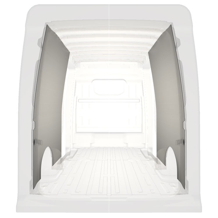 Revestimiento integral ligero para paredes internas de Volkswagen Crafter / MAN TGE con puerta lateral a ambos lados. Los revestimientos crearán un entorno de trabajo luminoso y agradable y son fáciles de limpiar.