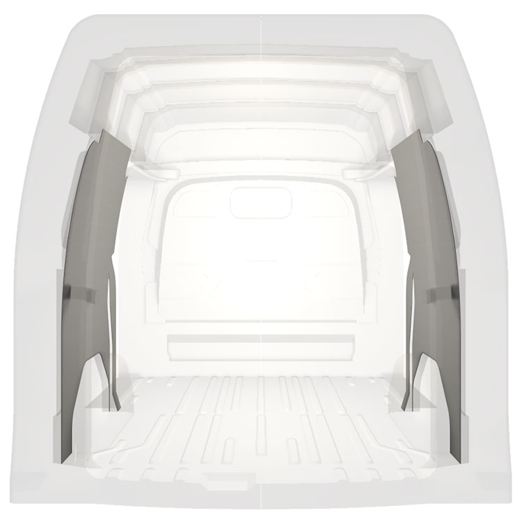 Revestimiento integral ligero para paredes internas de Ford Transit Custom con puerta lateral a ambos lados. Los revestimientos crearán un entorno de trabajo luminoso y agradable y son fáciles de limpiar.