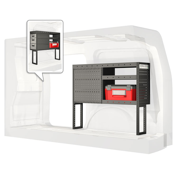 El equipamiento ha sido especialmente diseñado para garantizar el ajuste óptimo para el vehículo, así como la mayor funcionalidad y seguridad posible. Se ha desarrollado para uso profesional, es versátil y está destinado para trabajos de servicio en diversos tipos de negocio. Todas las estanterías están equipadas con alfombrillas de goma, y todos los cajones con alfombrillas de espuma de plástico. Los accesorios de montaje están incluidos.