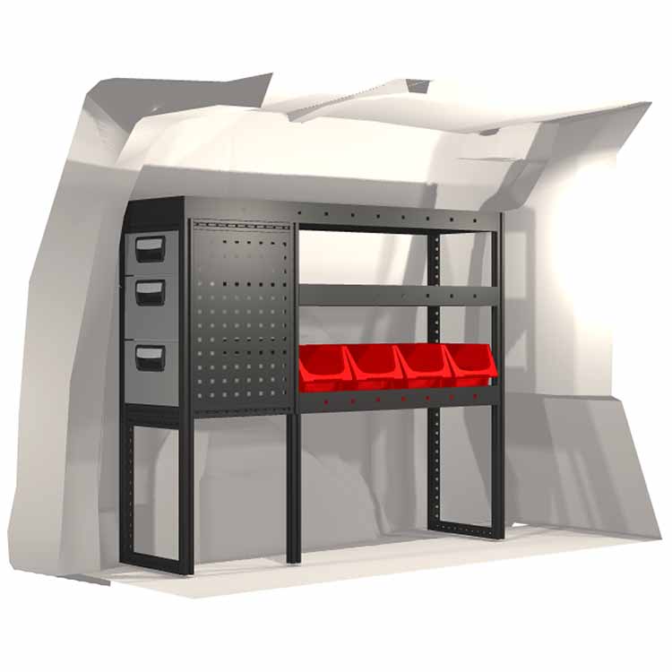 El equipamiento ha sido especialmente diseñado para garantizar el ajuste óptimo para el vehículo, así como la mayor funcionalidad y seguridad posible. Se ha desarrollado para uso profesional, es versátil y está destinado para trabajos de servicio en diversos tipos de negocio. Todas las estanterías están equipadas con alfombrillas de goma, y todos los cajones con alfombrillas de espuma de plástico. Los accesorios de montaje están incluidos.