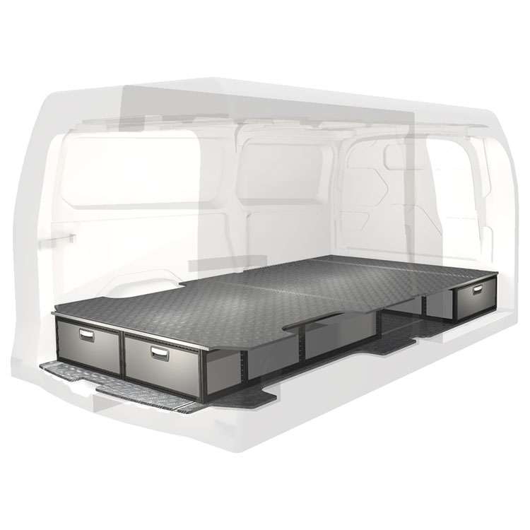 The kit is designed to be fitted on top of a Modul-Floor, utilizing the floor rails for a non-intrusive installation. The double floor is equipped with rails for easy installation of vehicle racking, and edging strips for a nice finish.