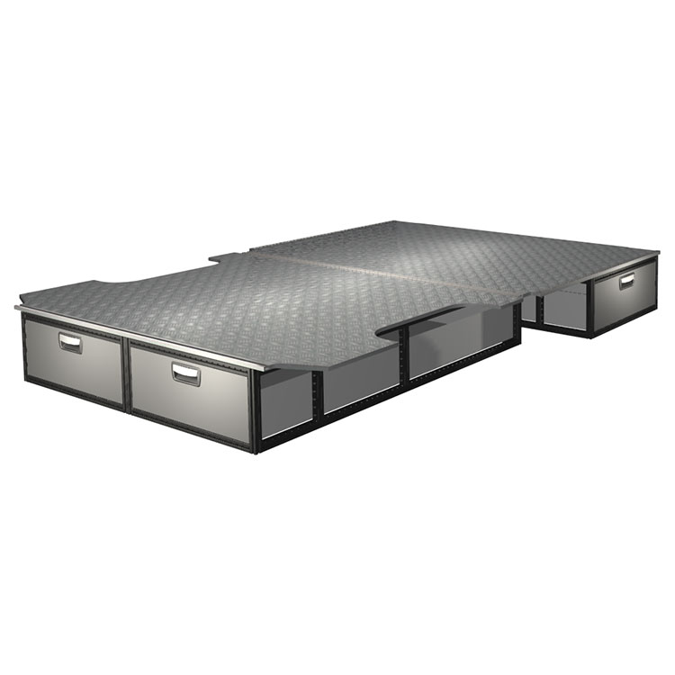 The kit is designed to be fitted on top of a wooden floor. The double floor is equipped with rails for easy installation of vehicle racking, and edging strips for a nice finish.