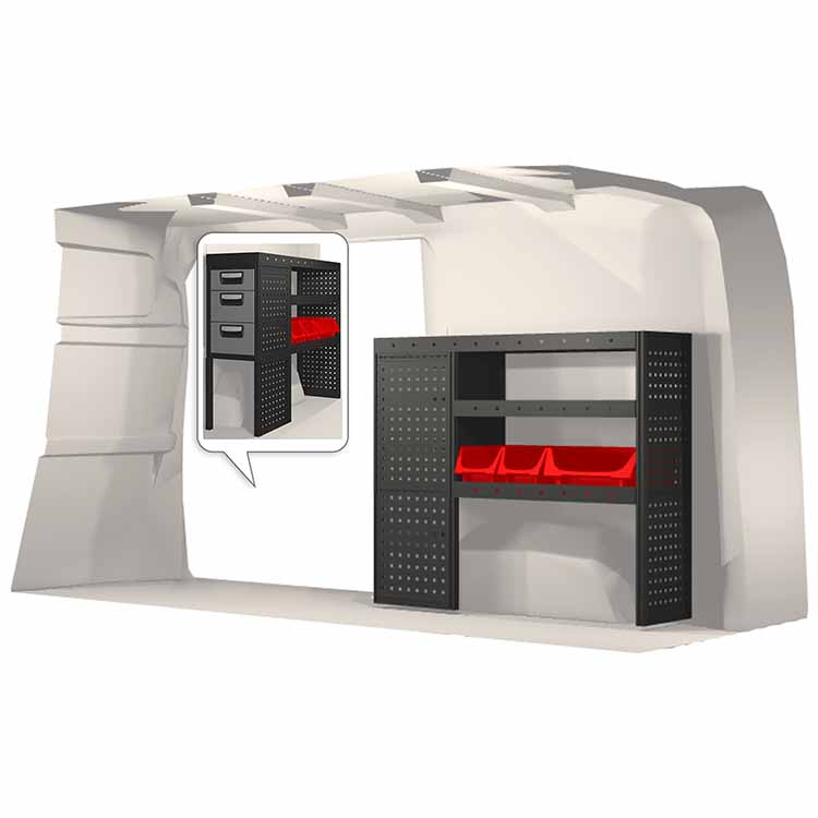 El equipamiento ha sido especialmente diseñado para garantizar el ajuste óptimo para el vehículo, así como la mayor funcionalidad y seguridad posible. Se ha desarrollado para uso profesional, es versátil y está destinado para trabajos de servicio en diversos tipos de negocio. Todas las estanterías están equipadas con alfombrillas de goma, y todos los cajones con alfombrillas de espuma de plástico. Los accesorios de montaje están incluidos.