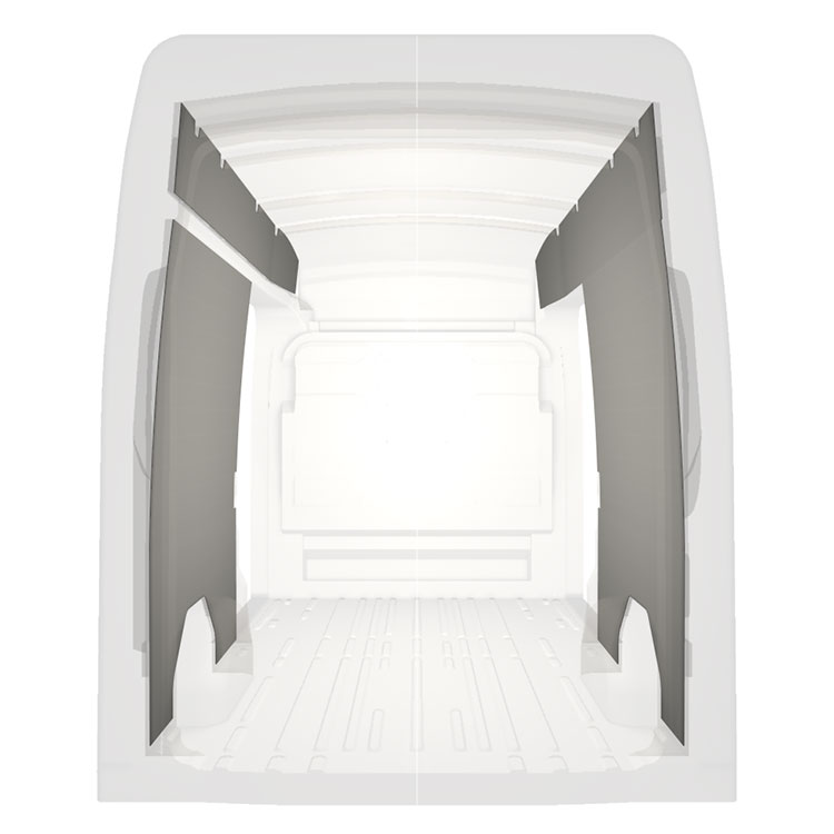 Revestimiento integral ligero para paredes internas de Ford Transit con puerta lateral a ambos lados. Los revestimientos crearán un entorno de trabajo luminoso y agradable y son fáciles de limpiar.