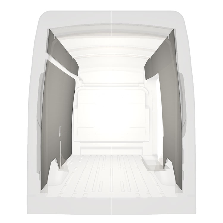 Revestimiento integral ligero para paredes interiores de Ford Transit con puerta lateral a la derecha. Los revestimientos crearán un entorno de trabajo luminoso y agradable y son fáciles de limpiar.