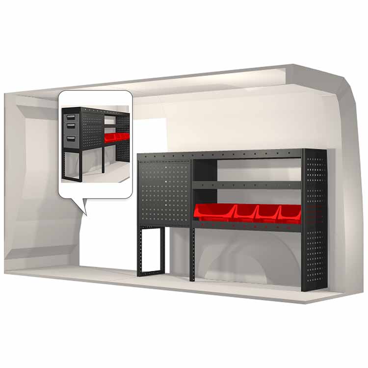 El equipamiento ha sido especialmente diseñado para garantizar el ajuste óptimo para el vehículo, así como la mayor funcionalidad y seguridad posible. Se ha desarrollado para uso profesional, es versátil y está destinado para trabajos de servicio en diversos tipos de negocio. Todas las estanterías están equipadas con alfombrillas de goma, y todos los cajones con alfombrillas de espuma de plástico. Los accesorios de montaje están incluidos.
