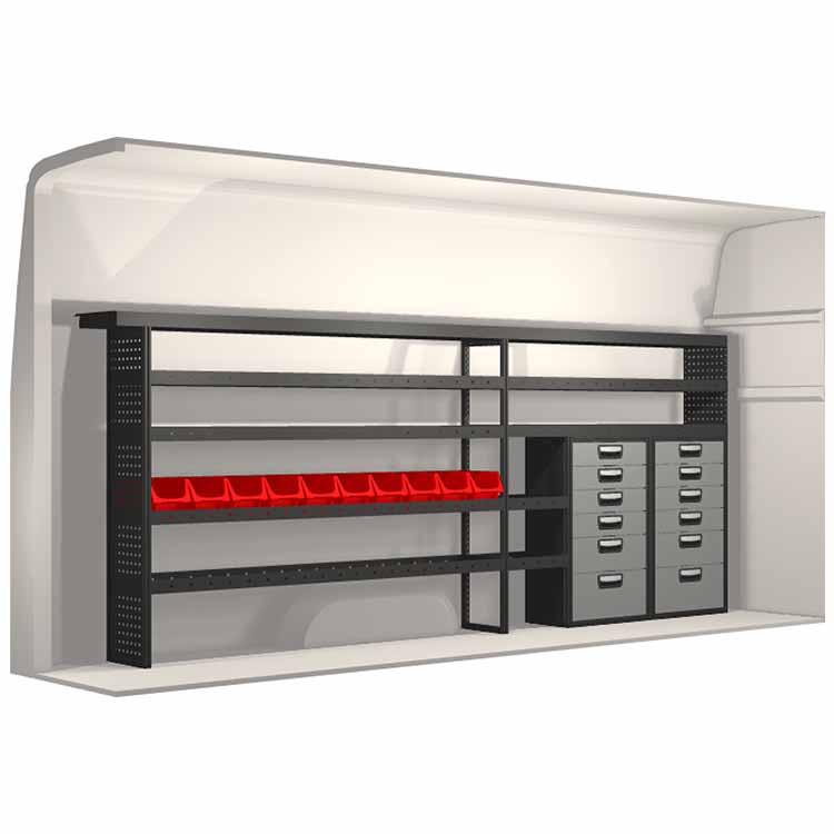El equipamiento ha sido especialmente diseñado para garantizar el ajuste óptimo para el vehículo, así como la mayor funcionalidad y seguridad posible. Se ha desarrollado para uso profesional, es versátil y está destinado para trabajos de servicio en diversos tipos de negocio. Todas las estanterías están equipadas con alfombrillas de goma, y todos los cajones con alfombrillas de espuma de plástico. Los accesorios de montaje están incluidos.