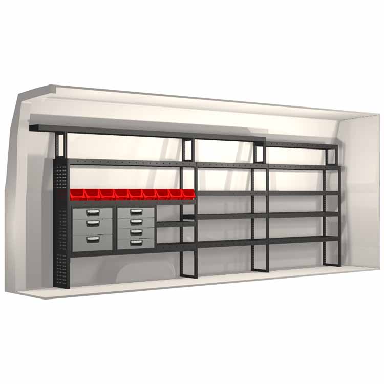 El equipamiento ha sido especialmente diseñado para garantizar el ajuste óptimo para el vehículo, así como la mayor funcionalidad y seguridad posible. Se ha desarrollado para uso profesional, es versátil y está destinado para trabajos de servicio en diversos tipos de negocio. Todas las estanterías están equipadas con alfombrillas de goma, y todos los cajones con alfombrillas de espuma de plástico. Los accesorios de montaje están incluidos.