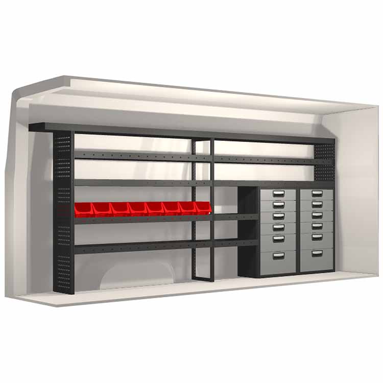 El equipamiento ha sido especialmente diseñado para garantizar el ajuste óptimo para el vehículo, así como la mayor funcionalidad y seguridad posible. Se ha desarrollado para uso profesional, es versátil y está destinado para trabajos de servicio en diversos tipos de negocio. Todas las estanterías están equipadas con alfombrillas de goma, y todos los cajones con alfombrillas de espuma de plástico. Los accesorios de montaje están incluidos.