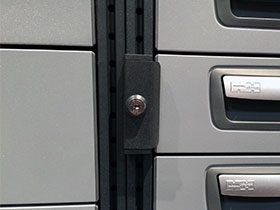The lock is mounted on the T-track and can lock one or two drawers. The lock can be placed anywhere on the system, and can also be used to lock Mobil-Box shelves. On forward-facing drawer units, the lock also provides additional load restraint in the event of heavy braking.