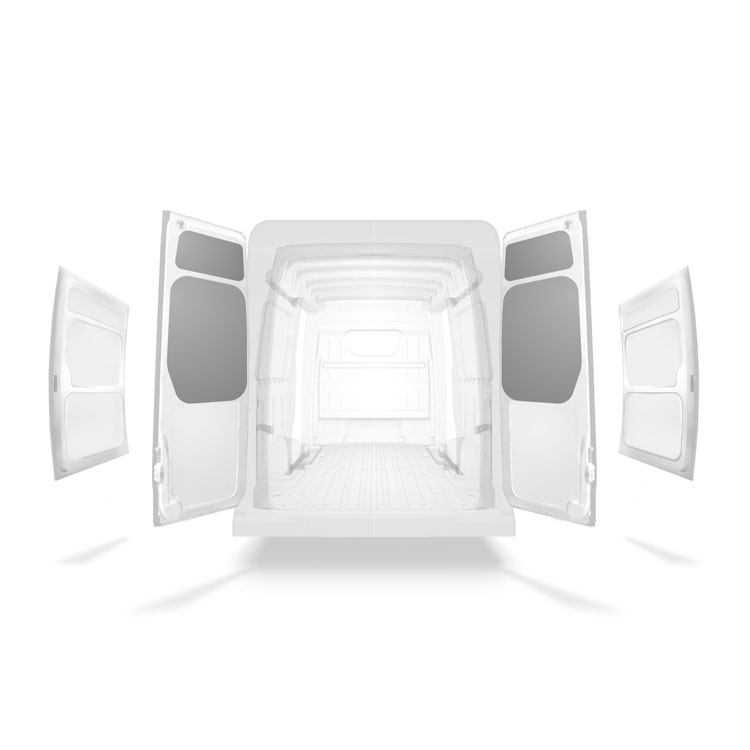 Revestimiento panelado posterior superior ligero para portón trasero de Volkswagen Crafter / MAN TGE con dos puertas laterales. Diseñado para conferir un acabado profesional al interior, los revestimientos para puertas protegerán la furgoneta y son fáciles de limpiar.