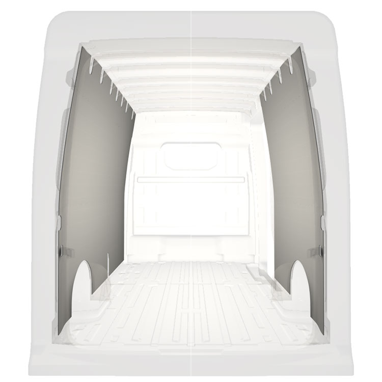 Revestimiento integral ligero para paredes interiores de Volkswagen Crafter / MAN TGE con puerta lateral a la derecha. Los revestimientos crearán un entorno de trabajo luminoso y agradable y son fáciles de limpiar.