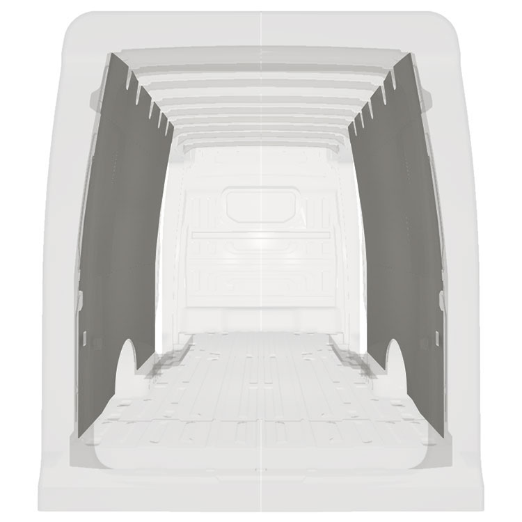 Revestimiento integral ligero para paredes internas de Volkswagen Crafter / MAN TGE con puerta lateral a ambos lados. Los revestimientos crearán un entorno de trabajo luminoso y agradable y son fáciles de limpiar.