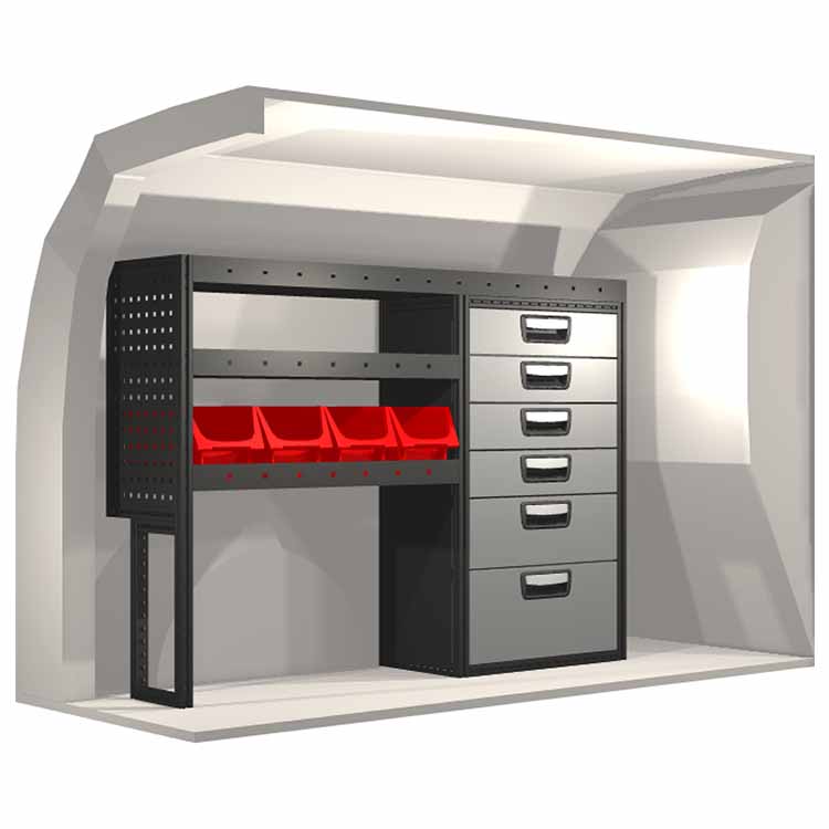 El equipamiento ha sido especialmente diseñado para garantizar el ajuste óptimo para el vehículo, así como la mayor funcionalidad y seguridad posible. Se ha desarrollado para uso profesional, es versátil y está destinado para trabajos de servicio en diversos tipos de negocio. Todas las estanterías están equipadas con alfombrillas de goma, y todos los cajones con alfombrillas de espuma de plástico. Los accesorios de montaje están incluidos.