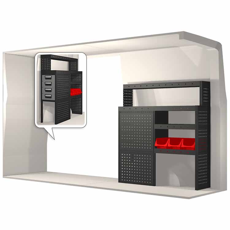 El equipamiento ha sido especialmente diseñado para garantizar el ajuste óptimo para el vehículo, así como la mayor funcionalidad y seguridad posible. Se ha desarrollado para uso profesional, es versátil y está destinado para trabajos de servicio en diversos tipos de negocio. Todas las estanterías están equipadas con alfombrillas de goma, y todos los cajones con alfombrillas de espuma de plástico. Los accesorios de montaje están incluidos.