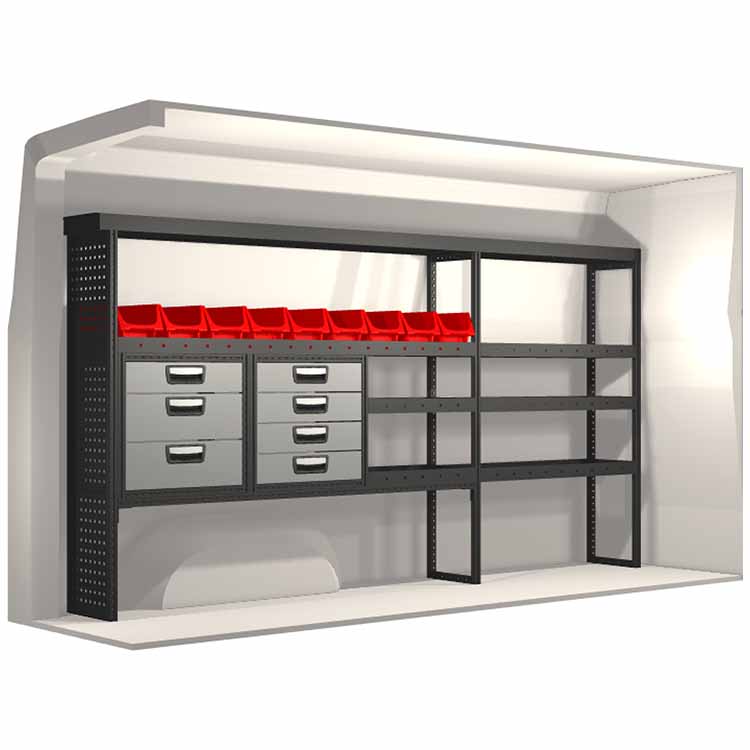 El equipamiento ha sido especialmente diseñado para garantizar el ajuste óptimo para el vehículo, así como la mayor funcionalidad y seguridad posible. Se ha desarrollado para uso profesional, es versátil y está destinado para trabajos de servicio en diversos tipos de negocio. Todas las estanterías están equipadas con alfombrillas de goma, y todos los cajones con alfombrillas de espuma de plástico. Los accesorios de montaje están incluidos.
