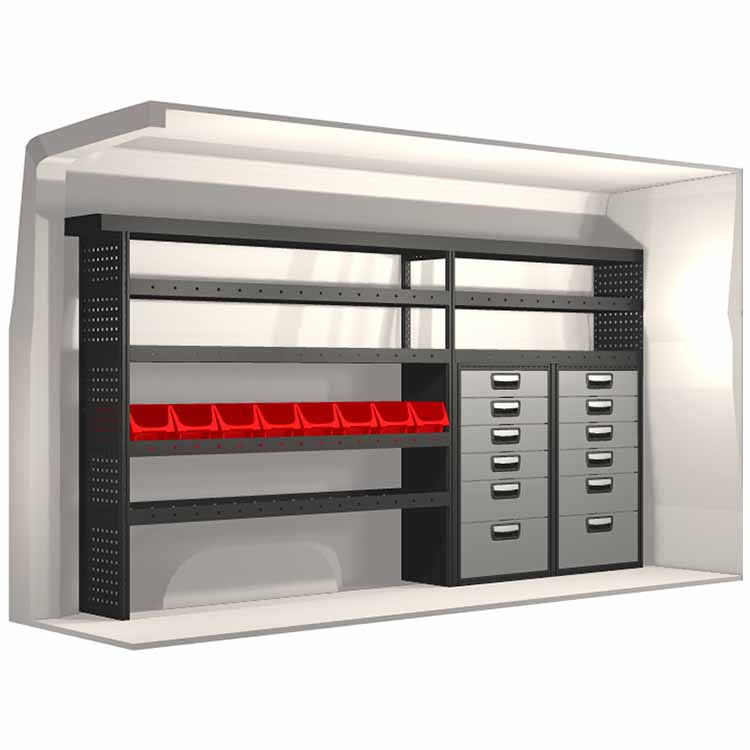 El equipamiento ha sido especialmente diseñado para garantizar el ajuste óptimo para el vehículo, así como la mayor funcionalidad y seguridad posible. Se ha desarrollado para uso profesional, es versátil y está destinado para trabajos de servicio en diversos tipos de negocio. Todas las estanterías están equipadas con alfombrillas de goma, y todos los cajones con alfombrillas de espuma de plástico. Los accesorios de montaje están incluidos.