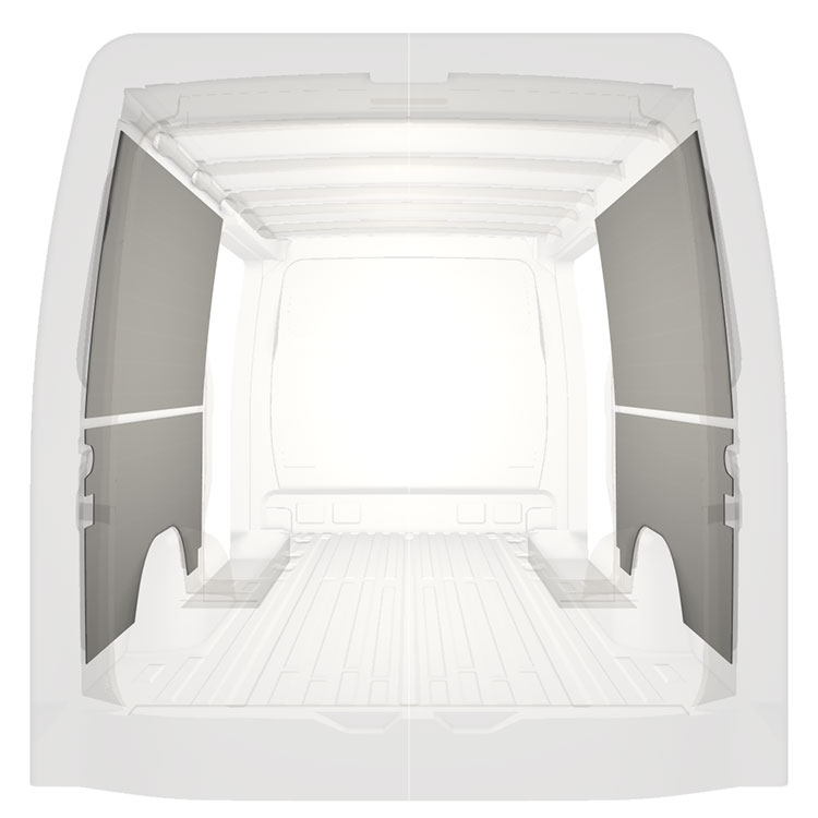 Panelado precortado ligero para paredes interiores de Mercedes Sprinter con puerta lateral a ambos lados. Los revestimientos crearán un entorno de trabajo luminoso y agradable y son fáciles de limpiar.