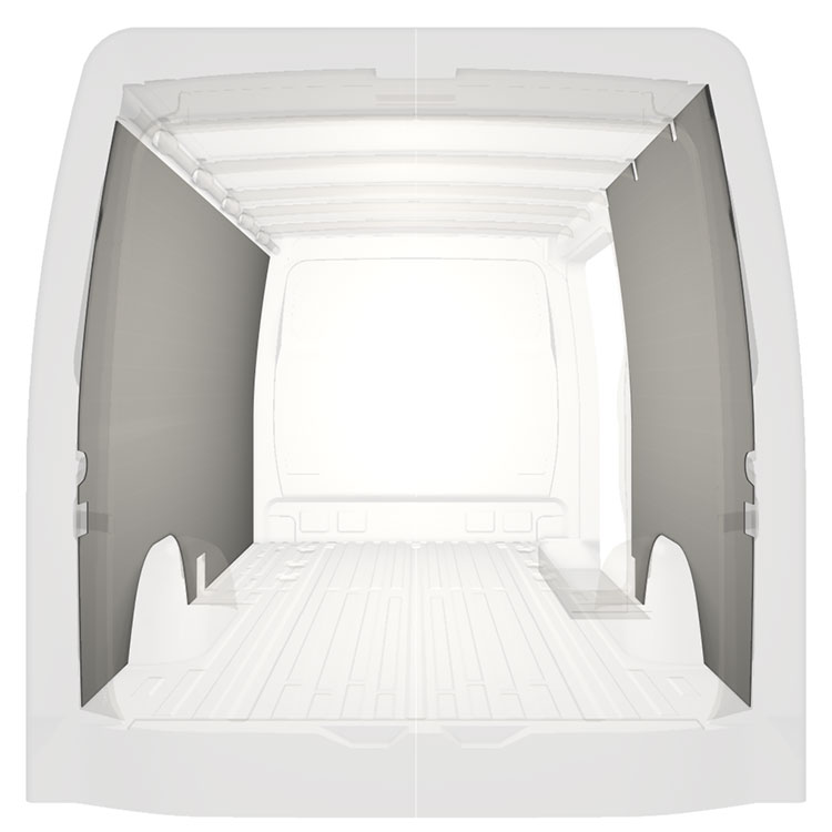 Revestimiento integral ligero para paredes interiores de Mercedes Sprinter con puerta lateral a la derecha. Los revestimientos crearán un entorno de trabajo luminoso y agradable y son fáciles de limpiar.
