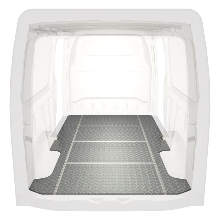 Lightweight and robust van floor with transverse rails for a Mercedes Sprinter with anti-slip aluminum tread plate and cargo rails (longitudinal and transverse) for quick and safe installation of racking systems and other accessories.
