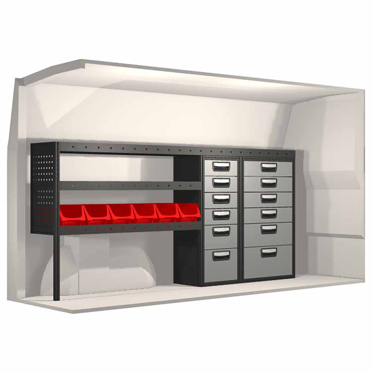 El equipamiento ha sido especialmente diseñado para garantizar el ajuste óptimo para el vehículo, así como la mayor funcionalidad y seguridad posible. Se ha desarrollado para uso profesional, es versátil y está destinado para trabajos de servicio en diversos tipos de negocio. Todas las estanterías están equipadas con alfombrillas de goma, y todos los cajones con alfombrillas de espuma de plástico. Los accesorios de montaje están incluidos.