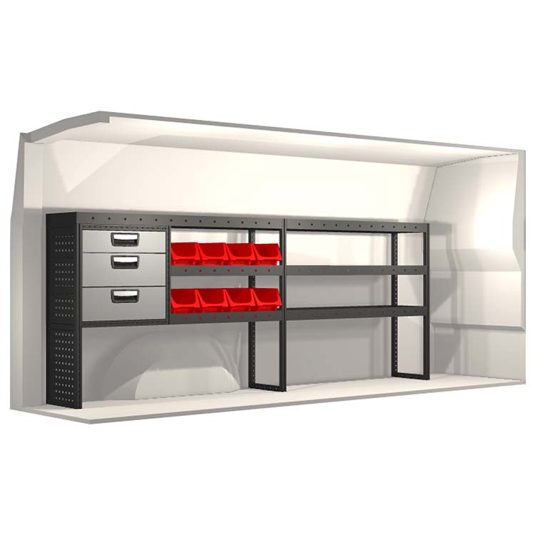 El equipamiento ha sido especialmente diseñado para garantizar el ajuste óptimo para el vehículo, así como la mayor funcionalidad y seguridad posible. Se ha desarrollado para uso profesional, es versátil y está destinado para trabajos de servicio en diversos tipos de negocio. Todas las estanterías están equipadas con alfombrillas de goma, y todos los cajones con alfombrillas de espuma de plástico. Los accesorios de montaje están incluidos.