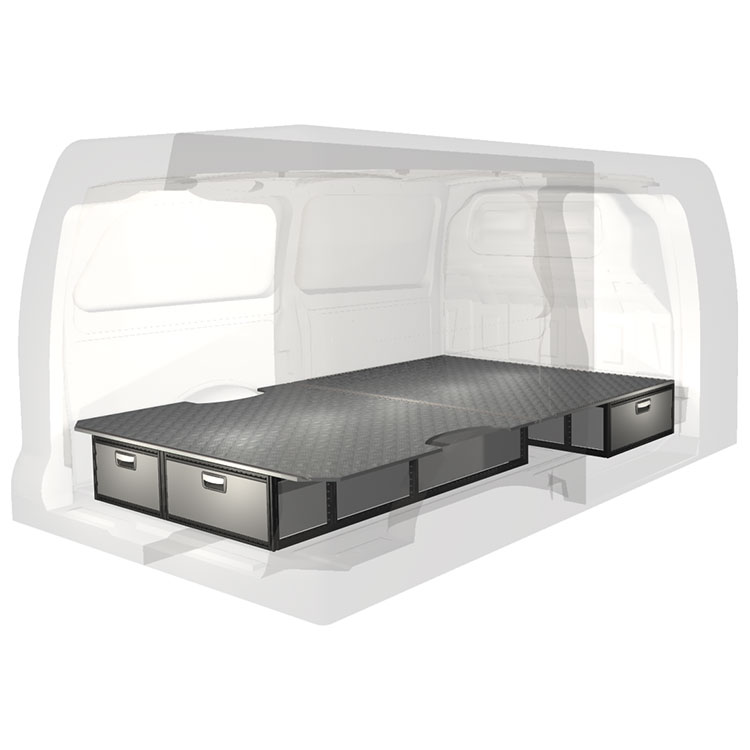 The kit is designed to be fitted on top of a wooden floor. The double floor is equipped with rails for easy installation of vehicle racking, and edging strips for a nice finish.
