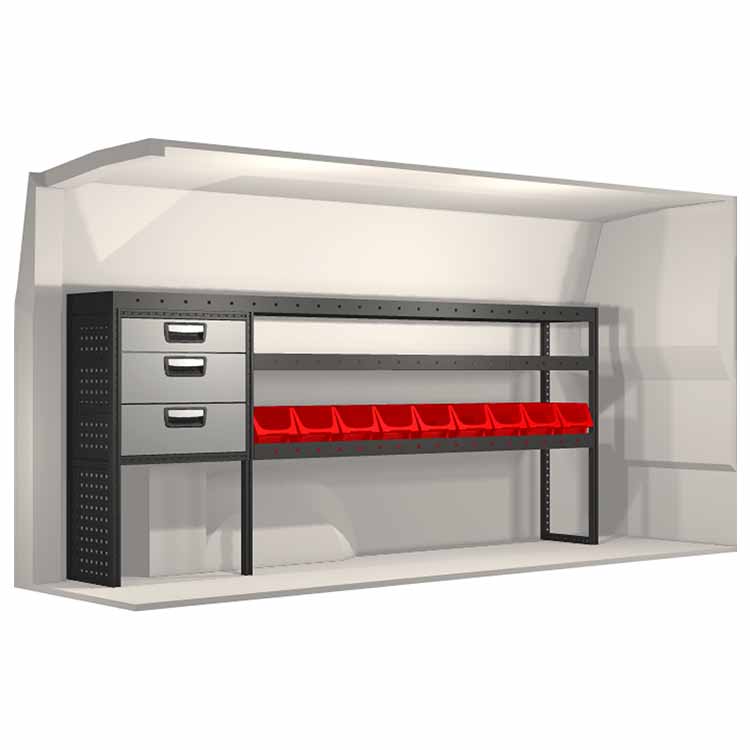 El equipamiento ha sido especialmente diseñado para garantizar el ajuste óptimo para el vehículo, así como la mayor funcionalidad y seguridad posible. Se ha desarrollado para uso profesional, es versátil y está destinado para trabajos de servicio en diversos tipos de negocio. Todas las estanterías están equipadas con alfombrillas de goma, y todos los cajones con alfombrillas de espuma de plástico. Los accesorios de montaje están incluidos.