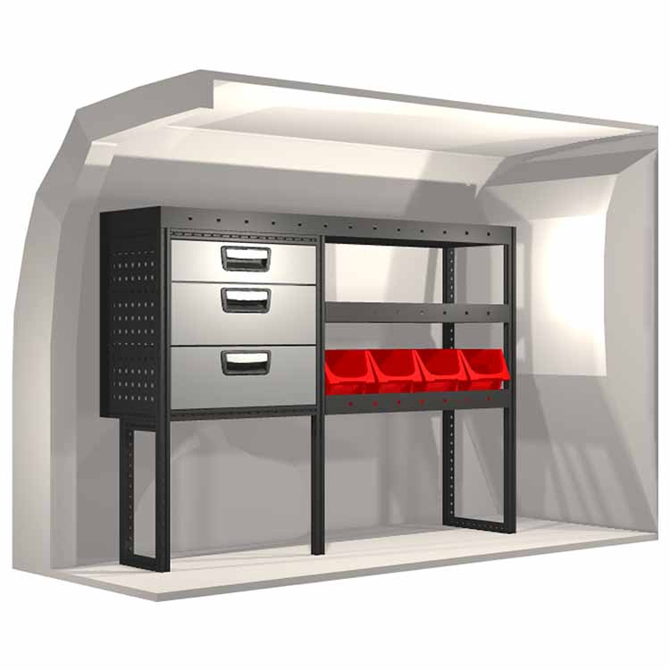 El equipamiento ha sido especialmente diseñado para garantizar el ajuste óptimo para el vehículo, así como la mayor funcionalidad y seguridad posible. Se ha desarrollado para uso profesional, es versátil y está destinado para trabajos de servicio en diversos tipos de negocio. Todas las estanterías están equipadas con alfombrillas de goma, y todos los cajones con alfombrillas de espuma de plástico. Los accesorios de montaje están incluidos.