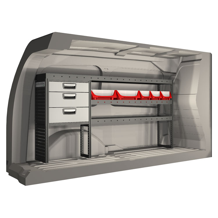 El equipamiento ha sido especialmente diseñado para garantizar el ajuste óptimo para el vehículo, así como la mayor funcionalidad y seguridad posible. Se ha desarrollado para uso profesional, es versátil y está destinado para trabajos de servicio en diversos tipos de negocio. Todas las estanterías están equipadas con alfombrillas de goma, y todos los cajones con alfombrillas de espuma de plástico. Los accesorios de montaje están incluidos.