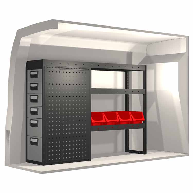 El equipamiento ha sido especialmente diseñado para garantizar el ajuste óptimo para el vehículo, así como la mayor funcionalidad y seguridad posible. Se ha desarrollado para uso profesional, es versátil y está destinado para trabajos de servicio en diversos tipos de negocio. Todas las estanterías están equipadas con alfombrillas de goma, y todos los cajones con alfombrillas de espuma de plástico. Los accesorios de montaje están incluidos.