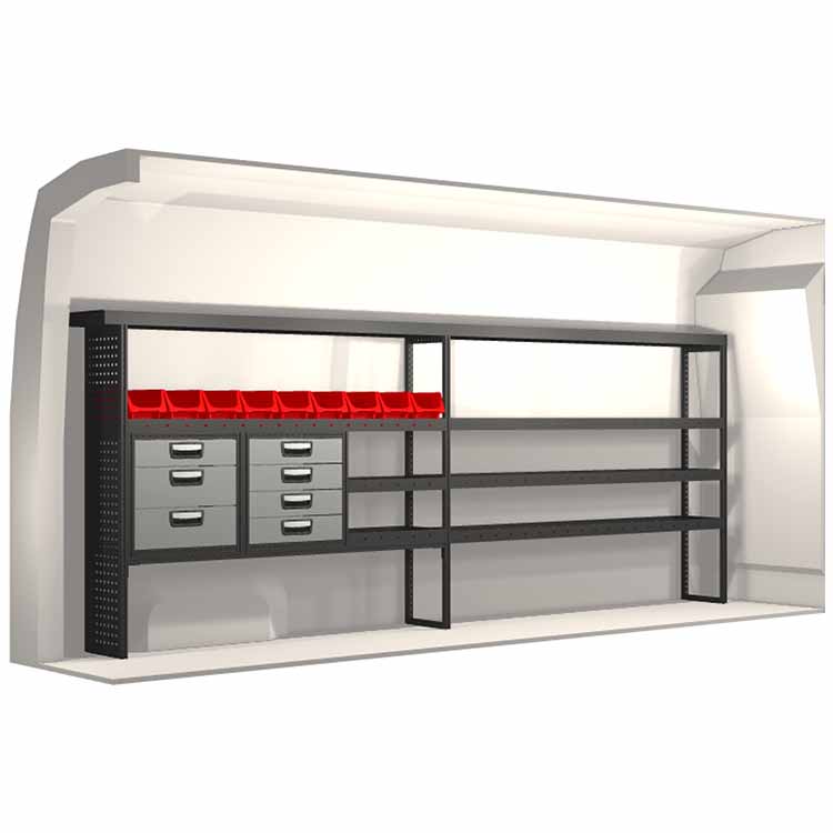 El equipamiento ha sido especialmente diseñado para garantizar el ajuste óptimo para el vehículo, así como la mayor funcionalidad y seguridad posible. Se ha desarrollado para uso profesional, es versátil y está destinado para trabajos de servicio en diversos tipos de negocio. Todas las estanterías están equipadas con alfombrillas de goma, y todos los cajones con alfombrillas de espuma de plástico. Los accesorios de montaje están incluidos.
