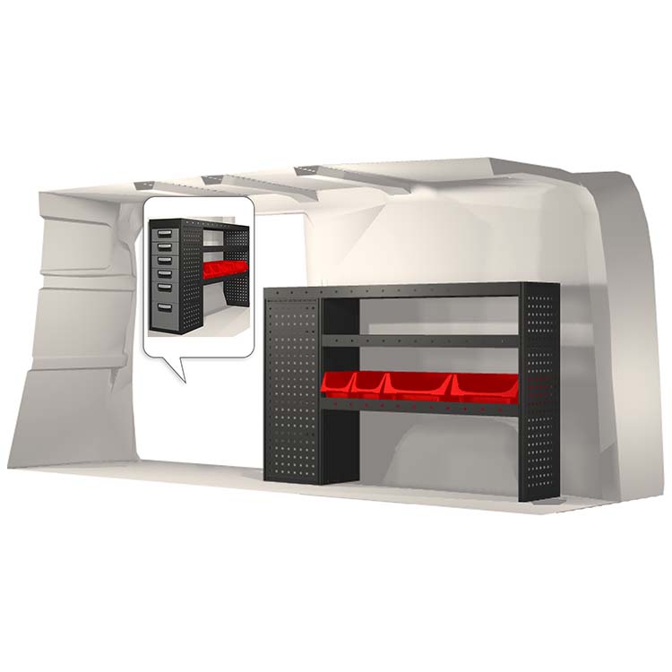 El equipamiento ha sido especialmente diseñado para garantizar el ajuste óptimo para el vehículo, así como la mayor funcionalidad y seguridad posible. Se ha desarrollado para uso profesional, es versátil y está destinado para trabajos de servicio en diversos tipos de negocio. Todas las estanterías están equipadas con alfombrillas de goma, y todos los cajones con alfombrillas de espuma de plástico. Los accesorios de montaje están incluidos.