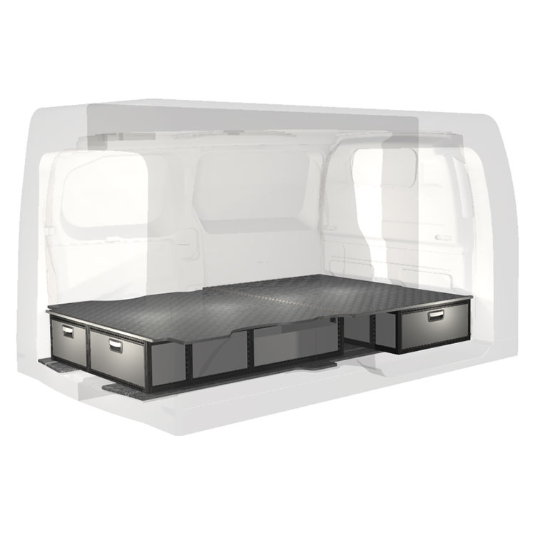 The kit is designed to be fitted on top of a Modul-Floor, utilizing the floor rails for a non-intrusive installation. The double floor is equipped with rails for easy installation of vehicle racking, and edging strips for a nice finish.