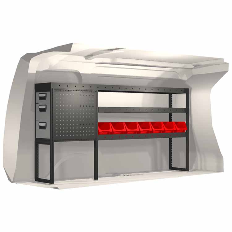 El equipamiento ha sido especialmente diseñado para garantizar el ajuste óptimo para el vehículo, así como la mayor funcionalidad y seguridad posible. Se ha desarrollado para uso profesional, es versátil y está destinado para trabajos de servicio en diversos tipos de negocio. Todas las estanterías están equipadas con alfombrillas de goma, y todos los cajones con alfombrillas de espuma de plástico. Los accesorios de montaje están incluidos.