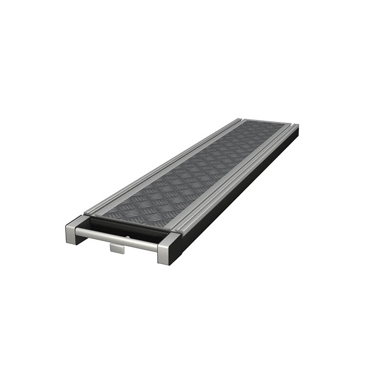 Lightweight and robust base frame made from ultra-high strength steel, with a front in anodized aluminum and a loading platform in lightweight sandwich material with an aluminum top.