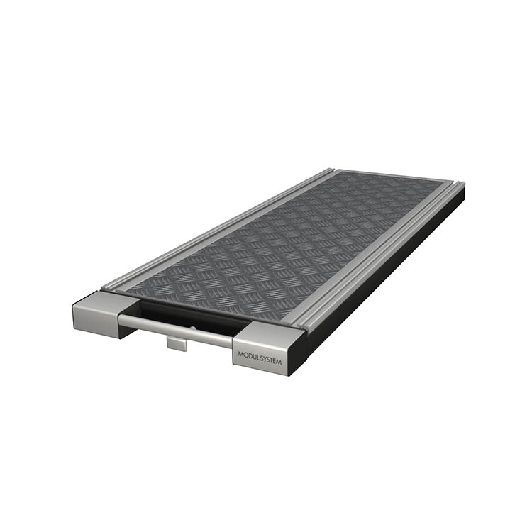 Lightweight and robust base frame made from ultra-high strength steel, with a front in anodized aluminum and a loading platform in lightweight sandwich material with an aluminum top.