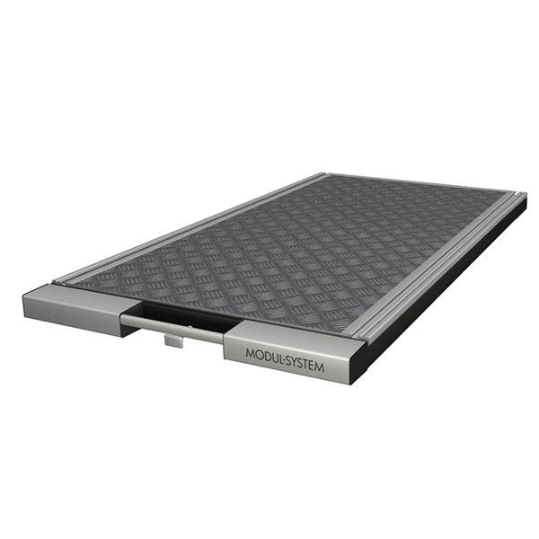 Lightweight and robust base frame made from ultra-high strength steel, with a front in anodized aluminum and a loading platform in lightweight sandwich material with an aluminum top.